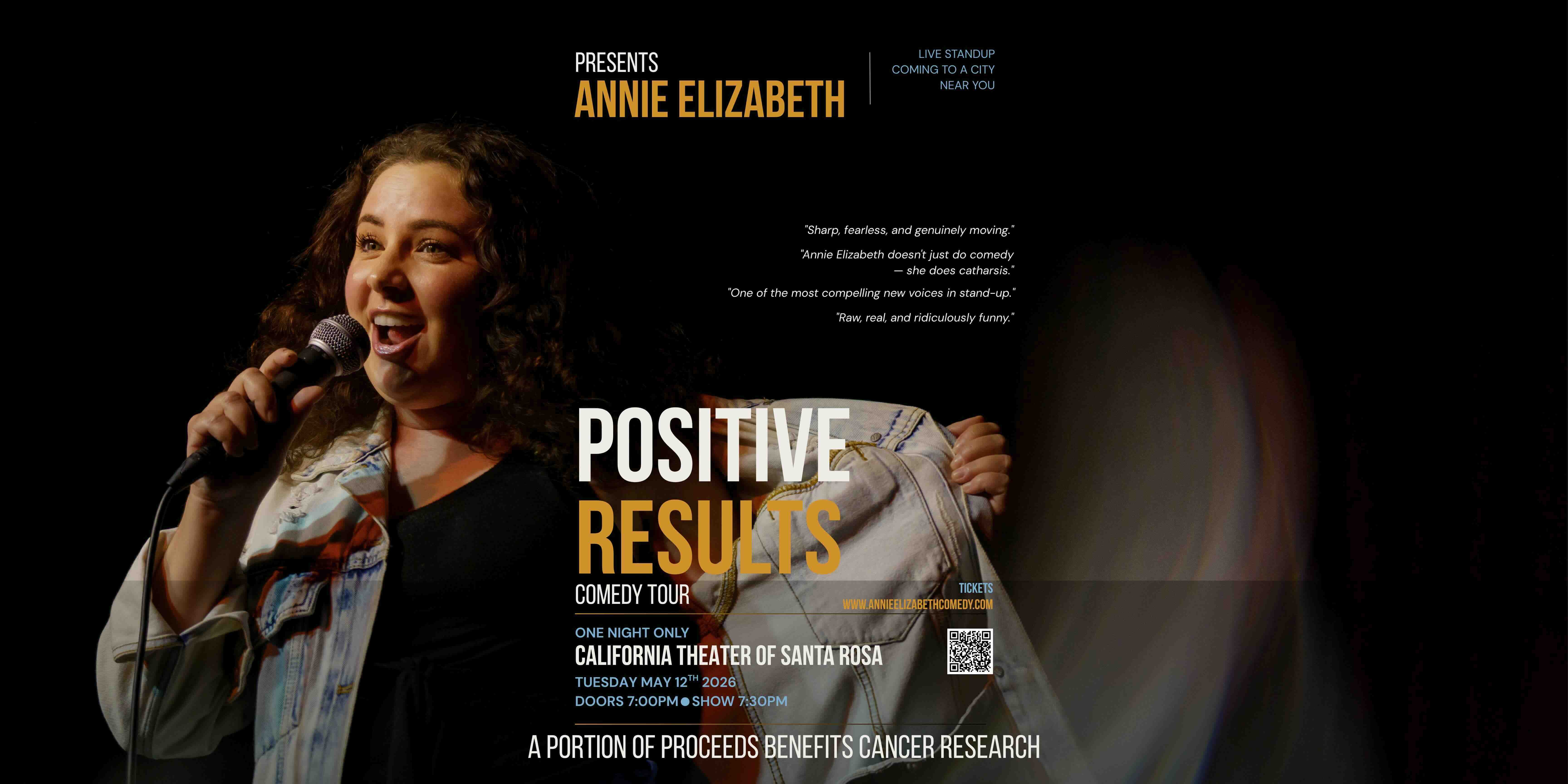Positive Results is the show that came out of all of it. It's about getting the call no one wants, about the absurdity of sitting in a doctor's office and laughing anyway, about family and fear and the reckless, beautiful decision to finally go after your dreams. It is dark and funny and deeply human — and a portion of every ticket sold goes directly to the cancer research that saved Annie's life.