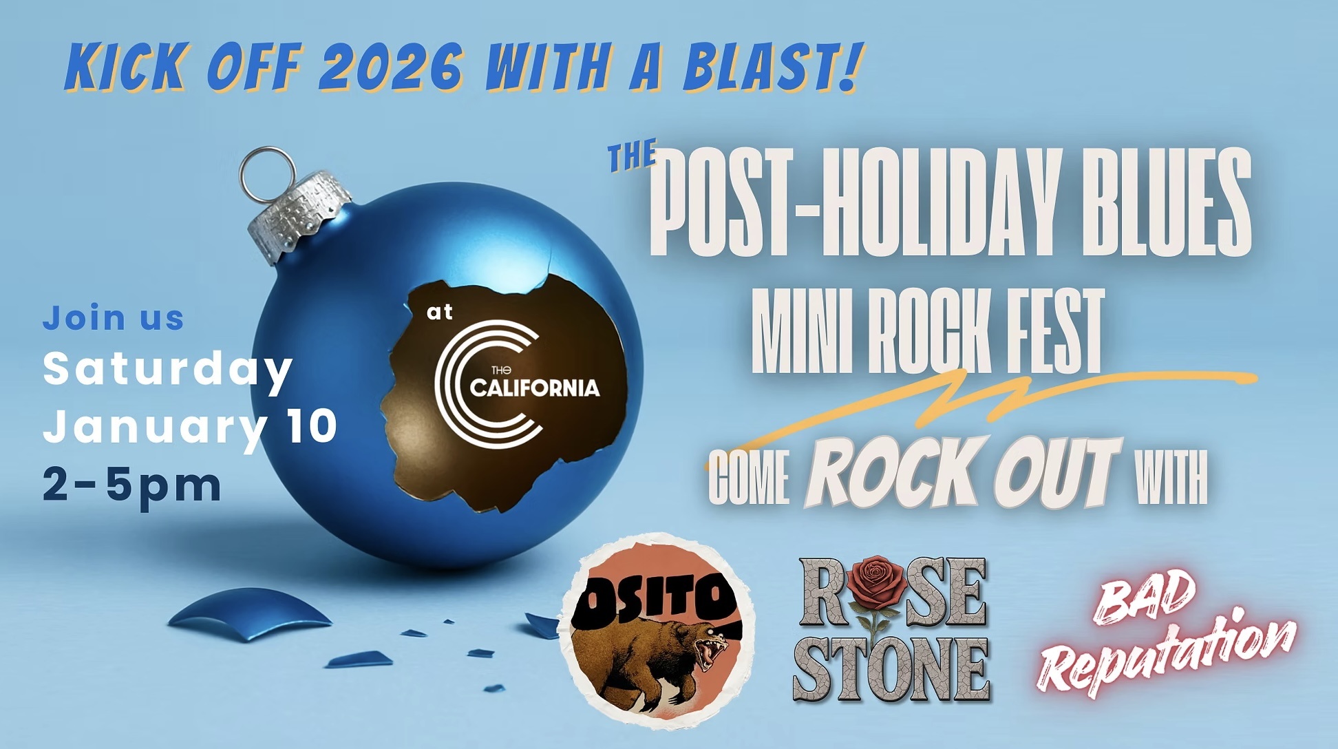 Kick off the new year with a high-energy mini music fest at The California Theatre on January 10! The afternoon features three powerhouse acts: Osito, serving up upbeat covers and catchy originals; Rose Stone, delivering the timeless sound of ’60s and ’70s rock with fresh energy; and Bad Reputation, a fierce tribute to Joan Jett that will bring pure rock-and-roll adrenaline to the stage.