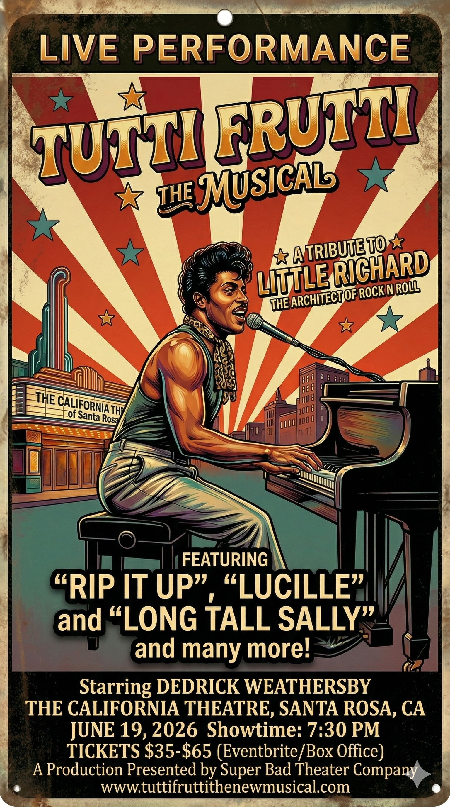 Prepare for a night of piano-pounding energy and soulful screams as Tutti Frutti: The Musical takes the stage at the historic California Theatre of Santa Rosa for one night only on June 19, 2026. This high-octane production celebrates the life and legendary hits of the man who gave Rock ‘n’ Roll its fire: Little Richard.